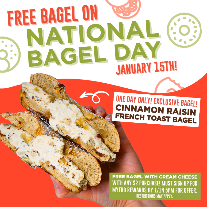 THB Bagelry & Deli is celebrating National Bagel Day on January 15. It's highly encouraged that folks sign up for myTHB rewards at www.eatTHB.com/rewards by January 14, 5:00 p.m. EST, so they can join in the fun. All myTHB rewards members will receive a Free Bagel with Cream Cheese reward that can be redeemed with a $2 purchase on National Bagel Day. We will also feature an exclusive bagel flavor for that day only. For questions, email THB at hello@eatTHB.com.