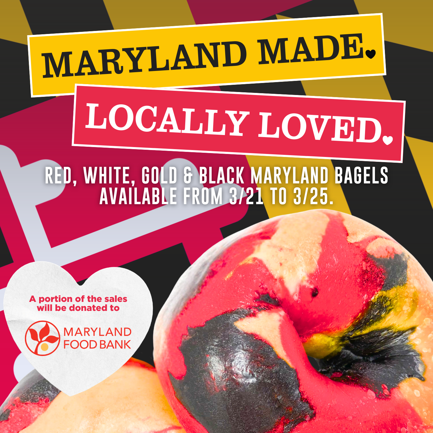 Celebrate Maryland Day from March 21–25 with the return of the Maryland Day Bagel, a customer favorite featuring the bold red, black, and yellow colors of the Maryland flag. During this promotion, 50 cents from each Maryland Day Bagel sold will benefit the Maryland Food Bank, supporting hunger relief efforts for families throughout the state.